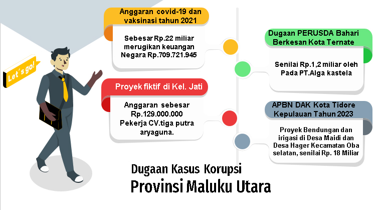 - Dugaan Kasus Korupsi Kolusi dan Nepotisme (KKN) pada penggunaan anggaran covid-19 dan vaksinasi tahun 2021 sebesar Rp. 22 miliar yang merugikan keuangan Negara sebesar Rp.709.721.945. Sesuai perhitungan BPKP Malut yang melekat dinas BPBD dan dinas kesehatan kota ternate yang diduga melibatkan ketua satgas covid-19 Kota Ternate. Saat ini, ketua Satgas covid-19 Kota Ternate menjabat sebagai walikota Ternate sesuai dengan fakta persidangan yang disampaiakan salah satu terdakwa dalam kasus tersebut.