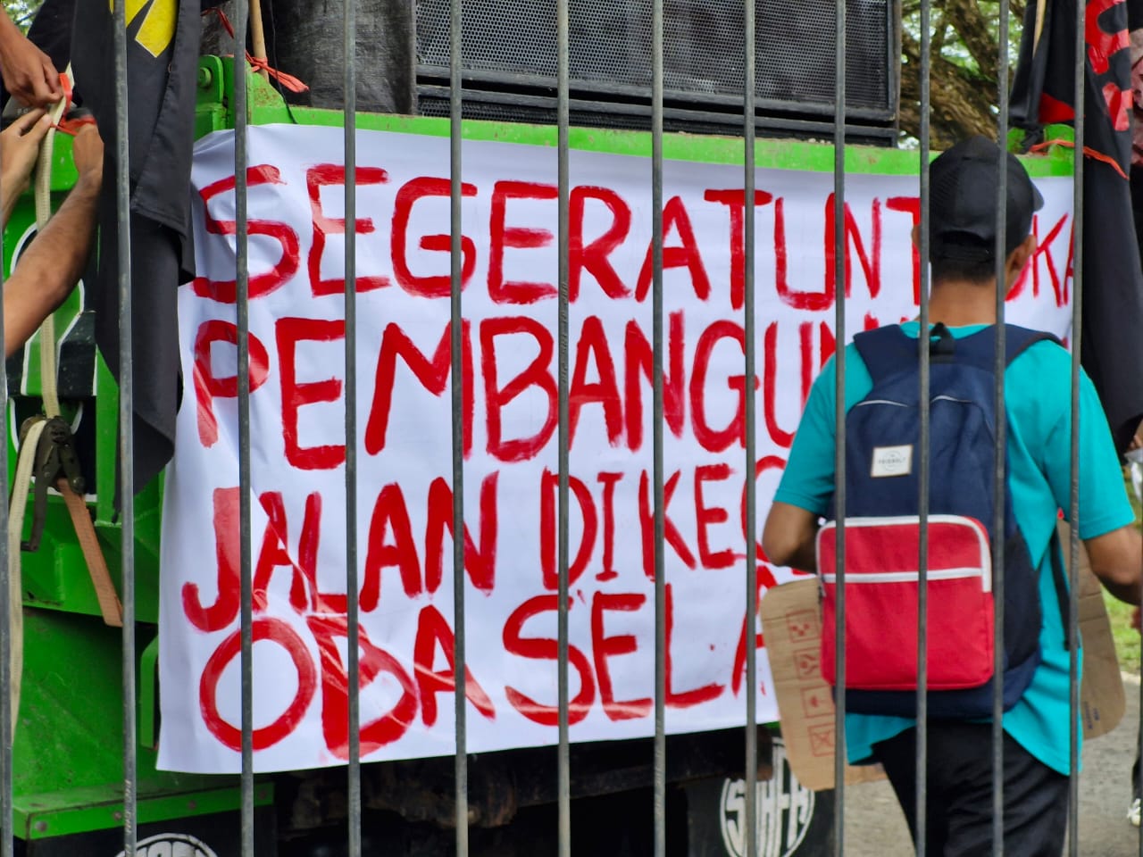 “Akibat dari mandeknya proses pekerjaan jalan itu, membuat masyarakat di tujuh desa menanggung pilu, dan juga berpengaruh pada lumpuhnya aktivitas pendidikan.” Kata koordinator aksi, Arif Haya.