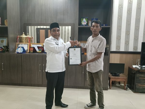 Pjs Bupati Halmahera Barat Dheni Tjan, S.H.,M.Si menyerahkan Sertifikat Badan Hukum Bumdesa Kepada Kepala Desa Bukubualawa